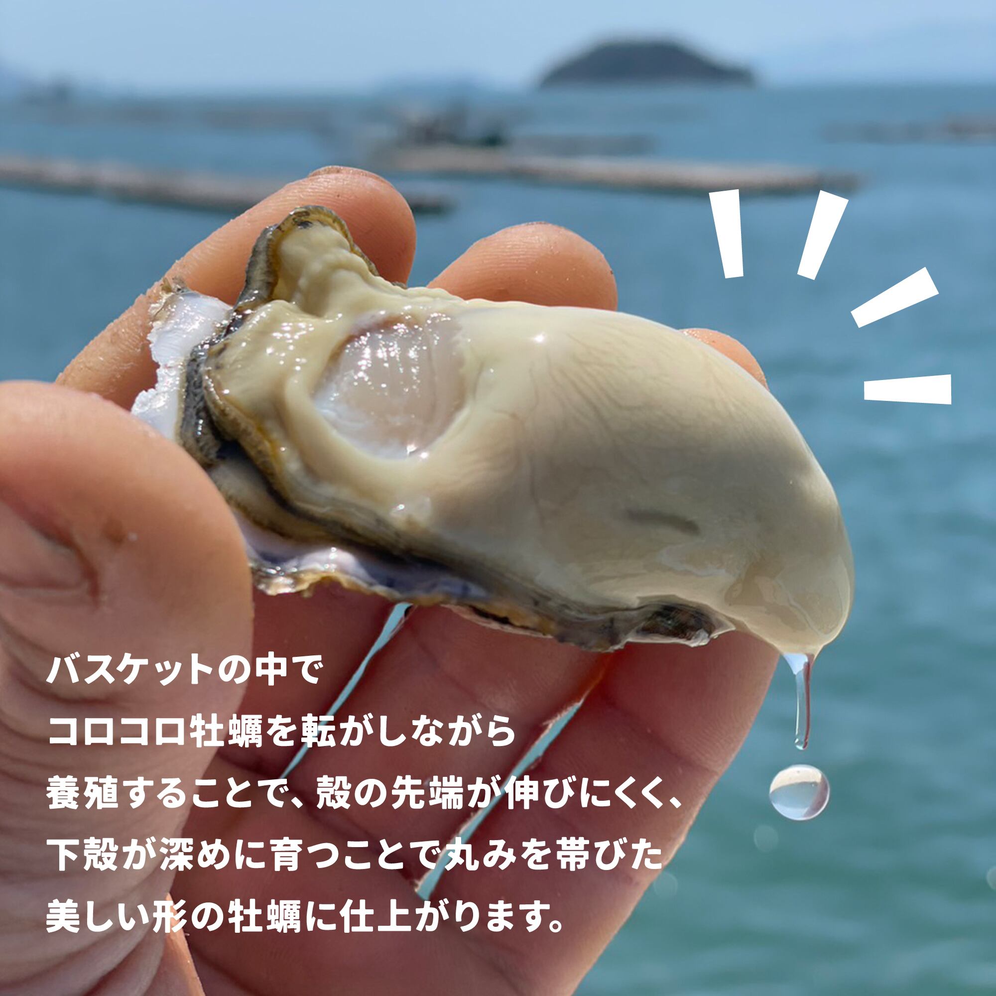 養殖方法「シングルシード式(バスケットでコロコロ転がして 殻の成長を抑制する事により身を太りやすくするという画期的な養殖方)」で育てたカップの深い、真牡蠣「松宝(しょうほう)」です。